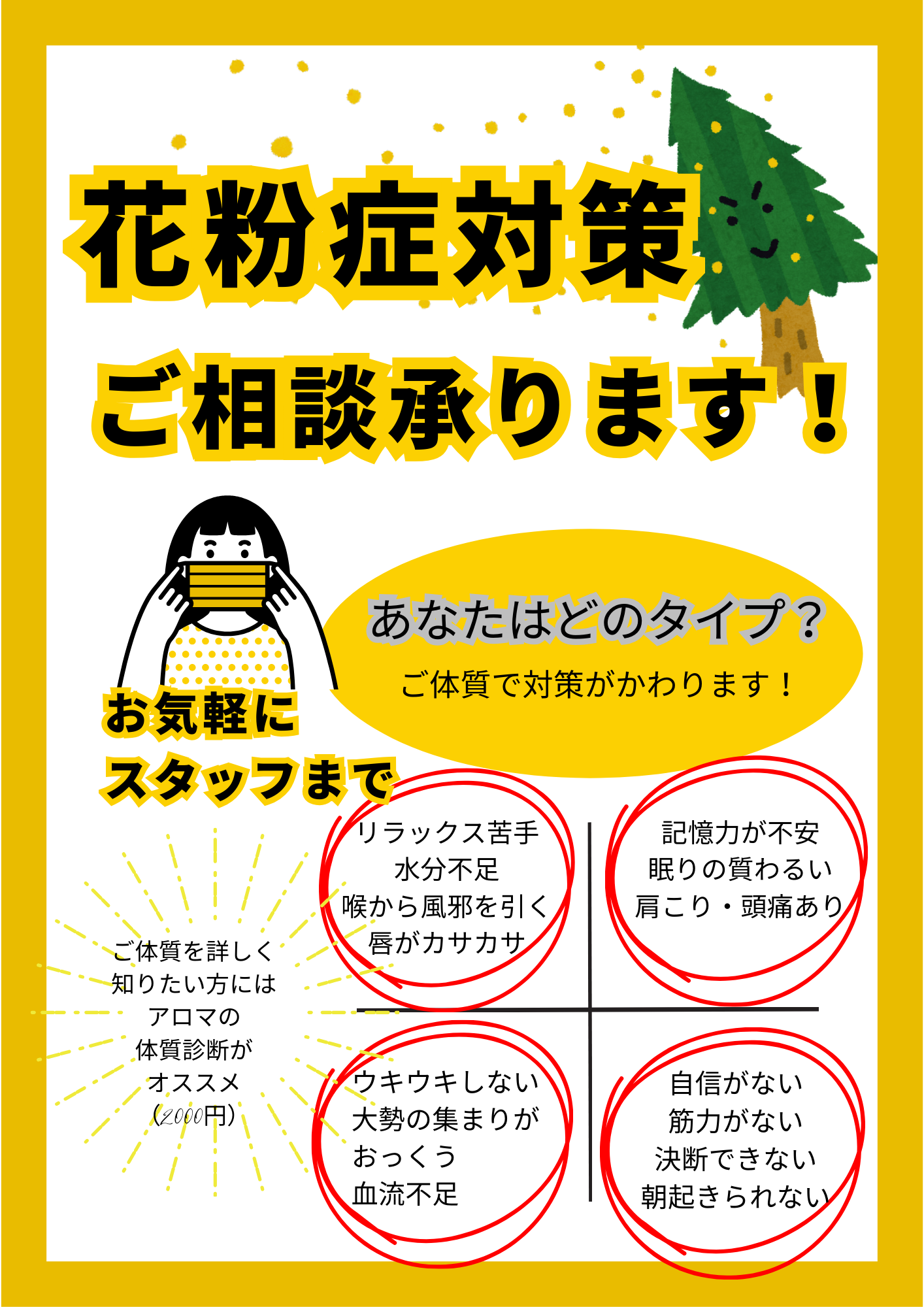 店頭で無料のカウンセリングもスタート。実は、ご体質によって、花粉症対策も少しずつ変えるとよいかも?をお伝えします